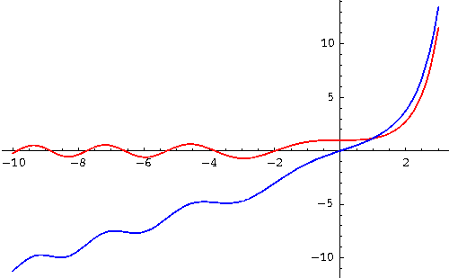 Below you see a picture of these two solutions. Note that for negative t, the solutions behave somewhat like the oscillating solutions of y''+y=0, while for positive t, they behave somewhat like the exponential solutions of the differential equation y''-y=0.